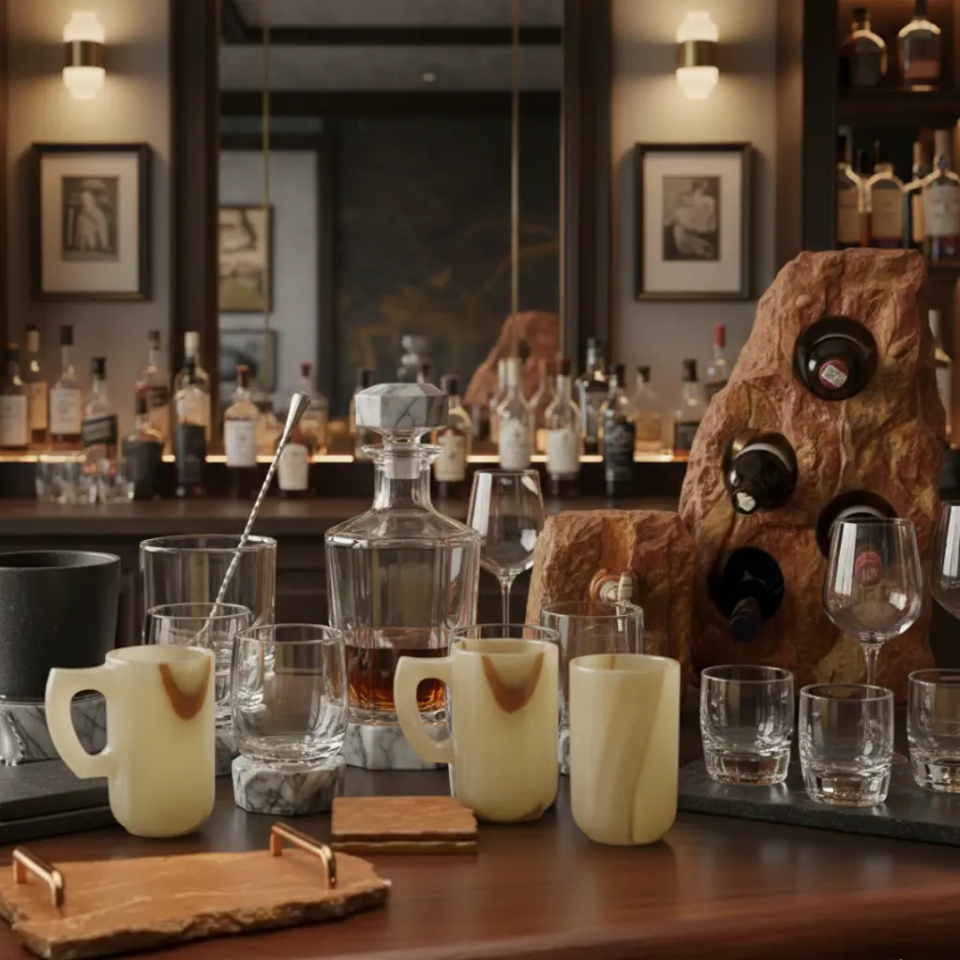 Stone and crystal bar sets, glasses, and accessories are best placed on bar counters, serving trolleys, sideboards, or dining consoles, where they become elegant focal points. Their premium materials and polished finishes add an unmistakable touch of luxury, elevating the overall ambience of entertaining areas.