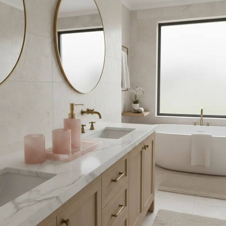 Semi-precious stone bathroom sets are perfectly suited for countertops, vanity units, and shelving, where they contribute to a clean yet indulgent aesthetic. Crafted from stones such as rose quartz, these accessories introduce a calm, spa-like ambience through soft tones, natural textures, and polished finishes.