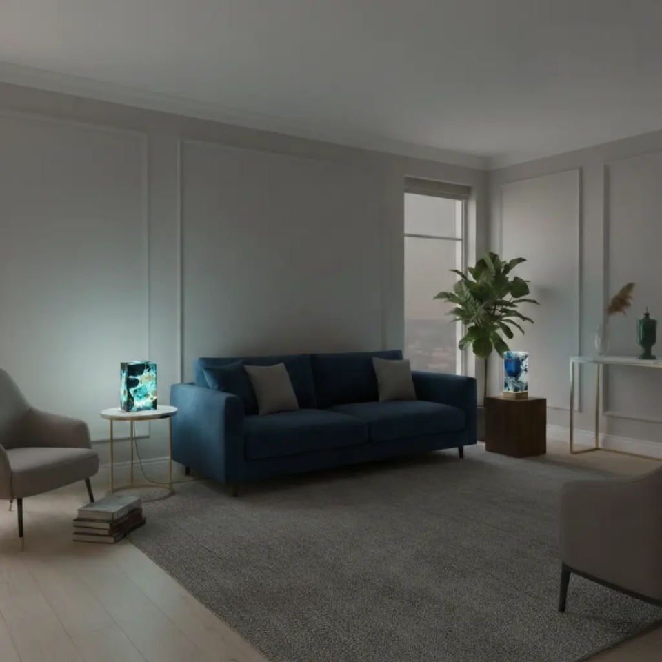 Crystal and stone-accent lamps are best positioned on side tables, console tops, or in softly lit corners of the living room, where they enhance comfort and ambience. These lamps create a warm, diffused glow that adds depth and calm to the space while their sculptural forms elevate lighting into a decorative feature. Crafted with premium materials and refined finishes, they blend functionality with artistry, introducing a luxurious atmosphere that feels both inviting and visually striking.