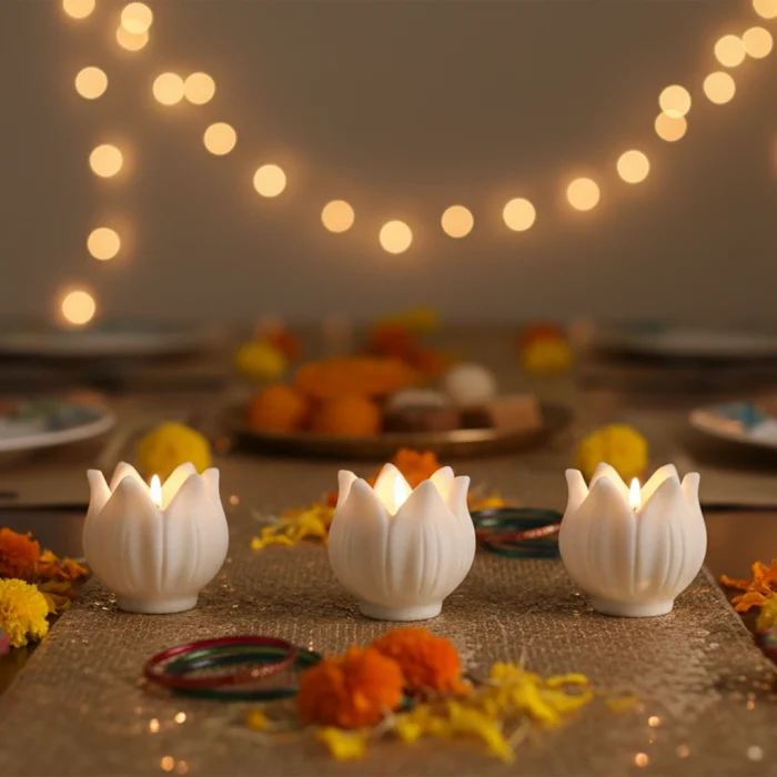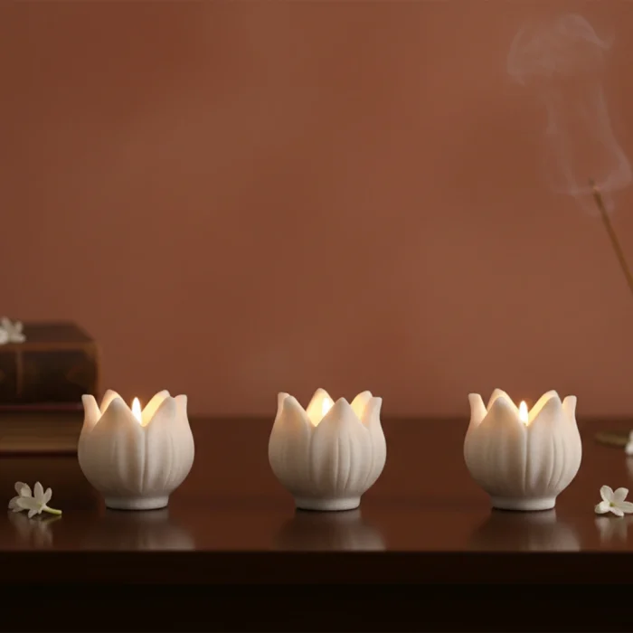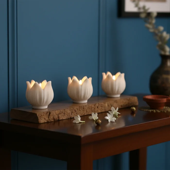 Inspired by the delicate lotus, these Marble Kamal Tealights are handcrafted to perfection, combining serenity and elegance. The polished marble radiates a soft, reflective glow when lit, creating a calming and luxurious ambiance suitable for pooja rituals, meditation, or sophisticated décor
