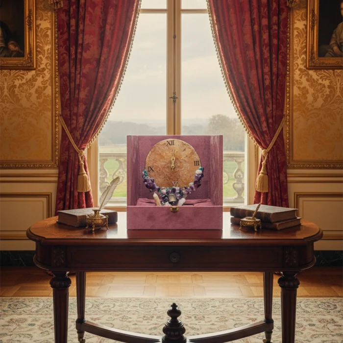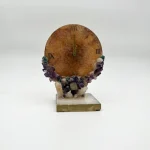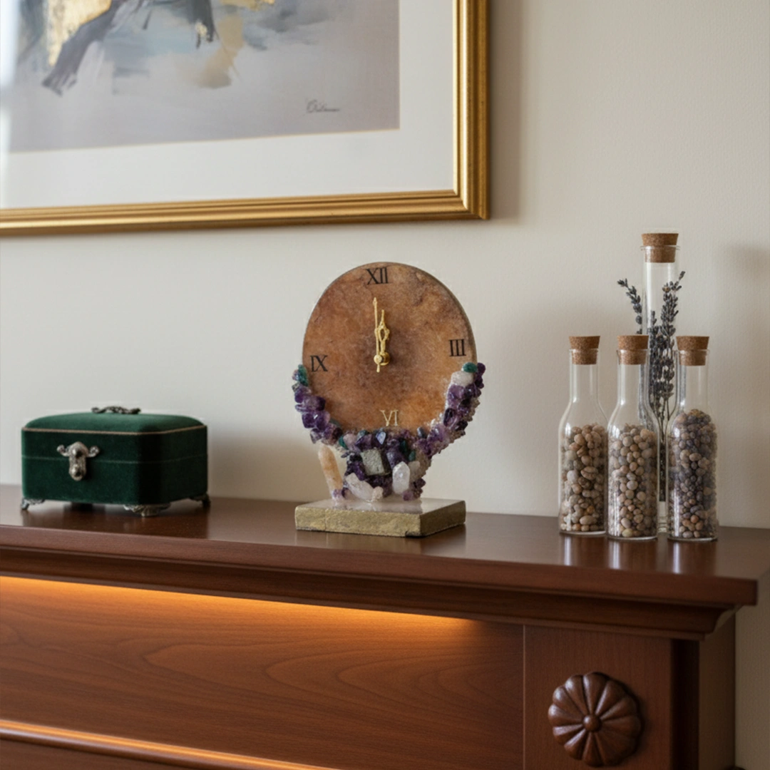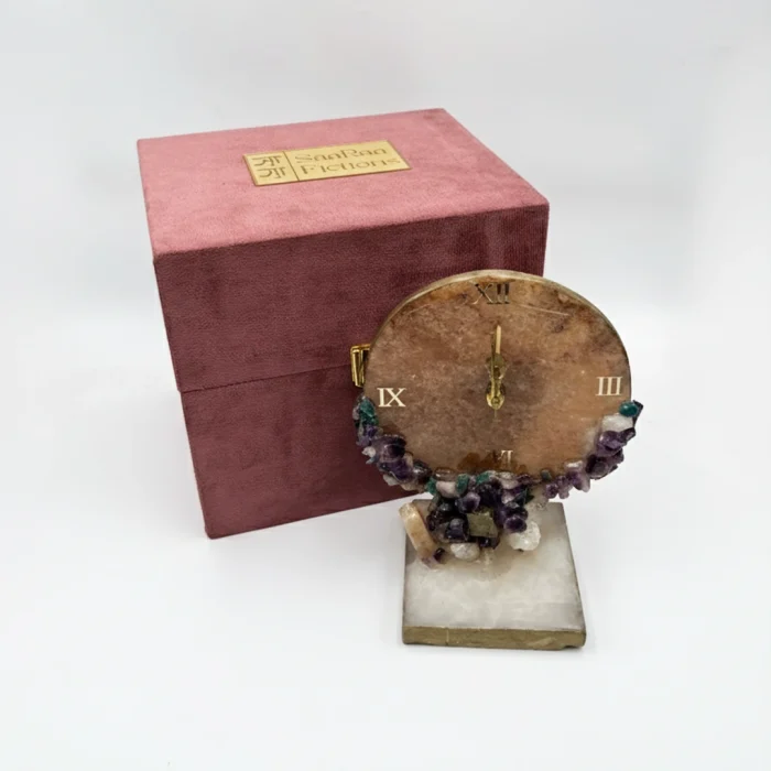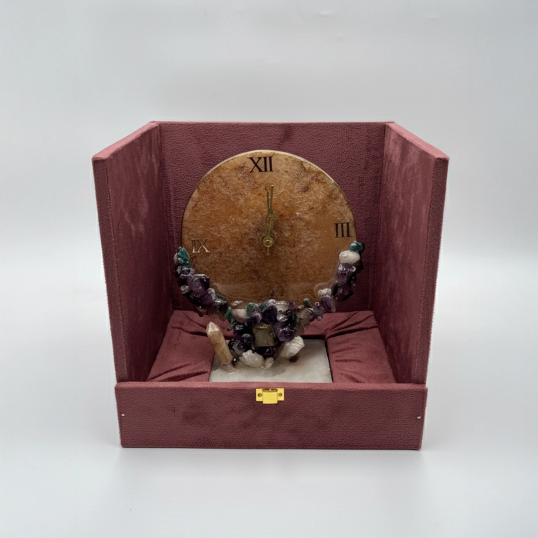 The Multi Crystal Desk Clock is a masterpiece of both design and metaphysical energy. Its quartz base provides stability while the clock face in yellow quartz exudes clarity and optimism. Surrounding it are hand-selected Amazonite (calming energy), Pyrite (protection and abundance), Citrine (success and positivity), Amethyst (peace and intuition), and Quartz (balance and harmony). This combination not only elevates your workspace aesthetically but also imbues it with a sense of energy, balance, and refinement