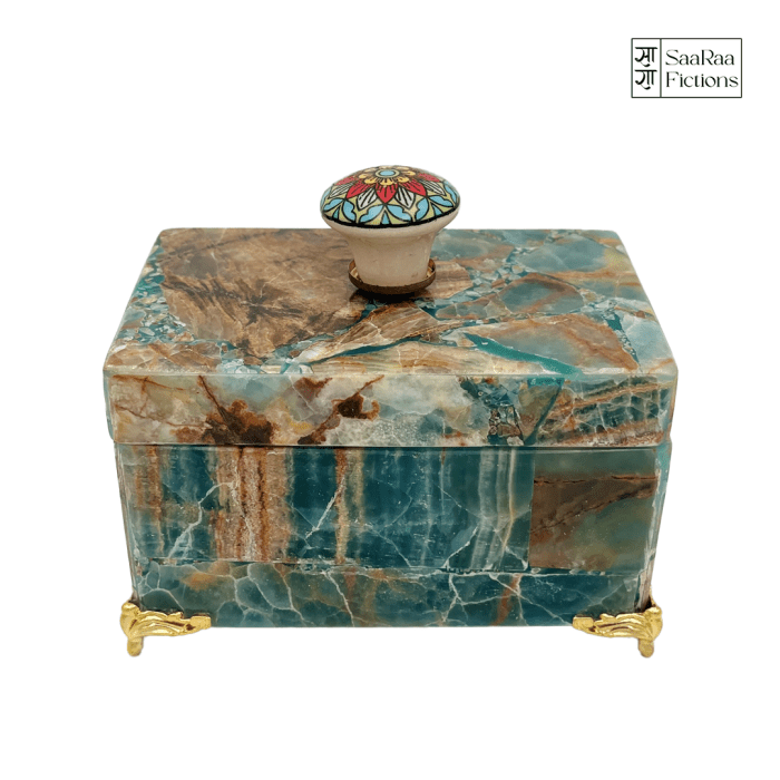 Natural Amazonite Multipurpose Box With Blue Pottery Knob And Golden Base - Luxury Stone Gifts & Home Décor Collection | SaaRaa Fictions