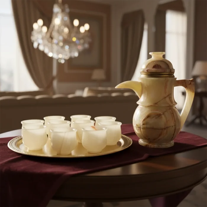 Indulge in the art of mindful sipping with our handcrafted Onyx Kawa Set. This elegant ensemble includes 6 kawa shot glasses and 1 coordinating jug, all carved from natural onyx — known for its grounding energy and striking patterns. Ideal for serving traditional kawa, herbal infusions, or even cold brews, each piece is a tribute to slow living and conscious craftsmanship. Hand-finished by local artisans, it’s a stunning addition to your hosting collection or a thoughtful gift steeped in heritage and beauty.