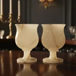 Indulge in the opulence of SaaRaa Fiction’s Victorian Onyx Wine Glasses, a masterful fusion of classic Victorian aesthetics and natural craftsmanship. Each glass is meticulously handcrafted from premium onyx, celebrated for its mesmerizing translucence and unique veining patterns. The intricate Victorian-inspired detailing adds a touch of vintage charm, making these wine glasses a perfect centerpiece for elegant gatherings or intimate dinners. Functional yet artistic, they are designed to enhance your wine experience while doubling as striking decor pieces. Whether as a thoughtful gift or an addition to your collection, these glasses embody sophistication, blending historical allure with the natural beauty of onyx.