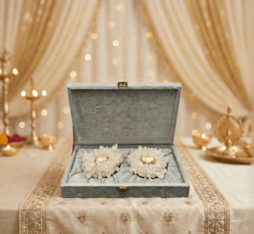 AQuartz Diya Set blends purity, elegance, and spiritual charm. Crafted from natural quartz, it radiates positivity—making it a beautiful wedding present gift for couples stepping into a new chapter.