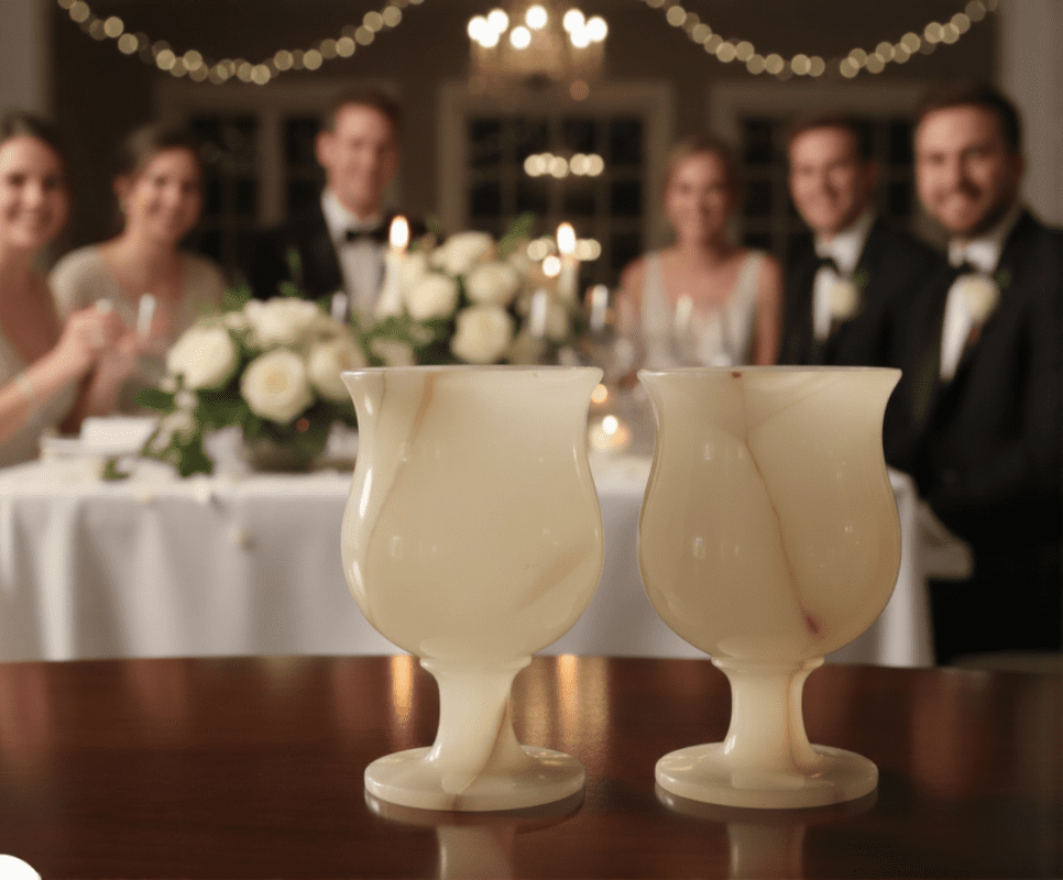These handcrafted Onyx wine glasses are a blend of decadence and artistic detail—perfect for gifting to celebration-loving couples.